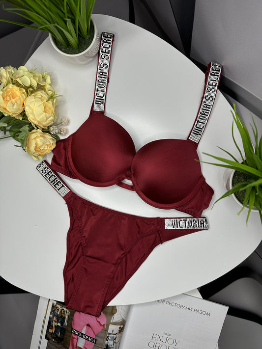 Shine Strap Push-Up Bra + Bombshell Shine Strap Brazilian Panty - Burgundy