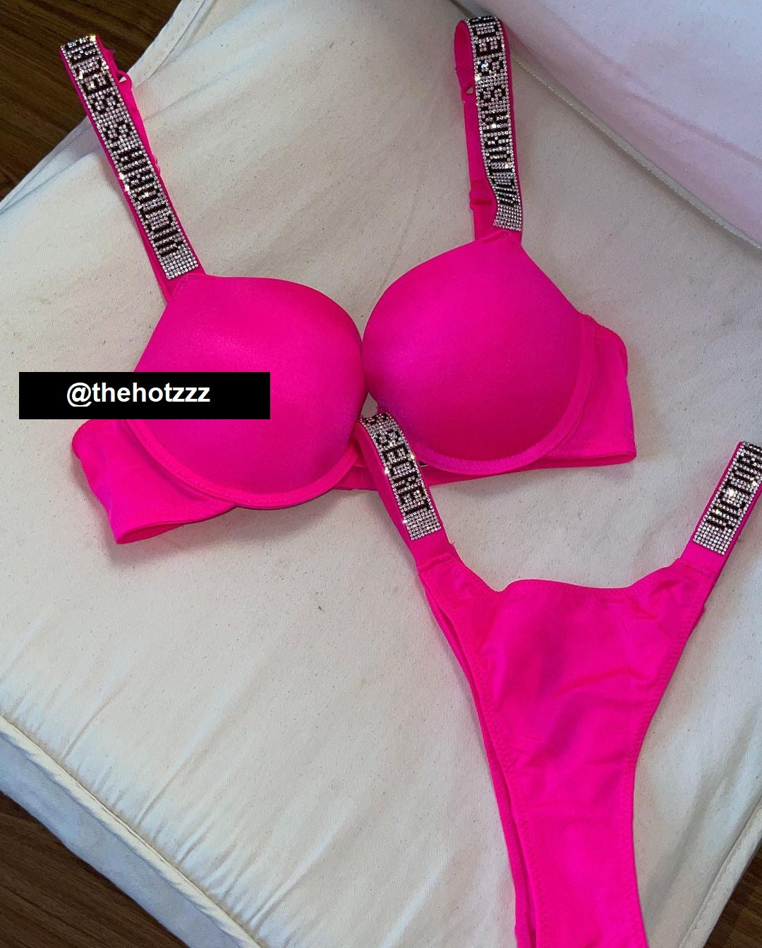 Shine Strap Push-Up Bra + Bombshell Shine Strap Brazilian Panty- Neon Pink