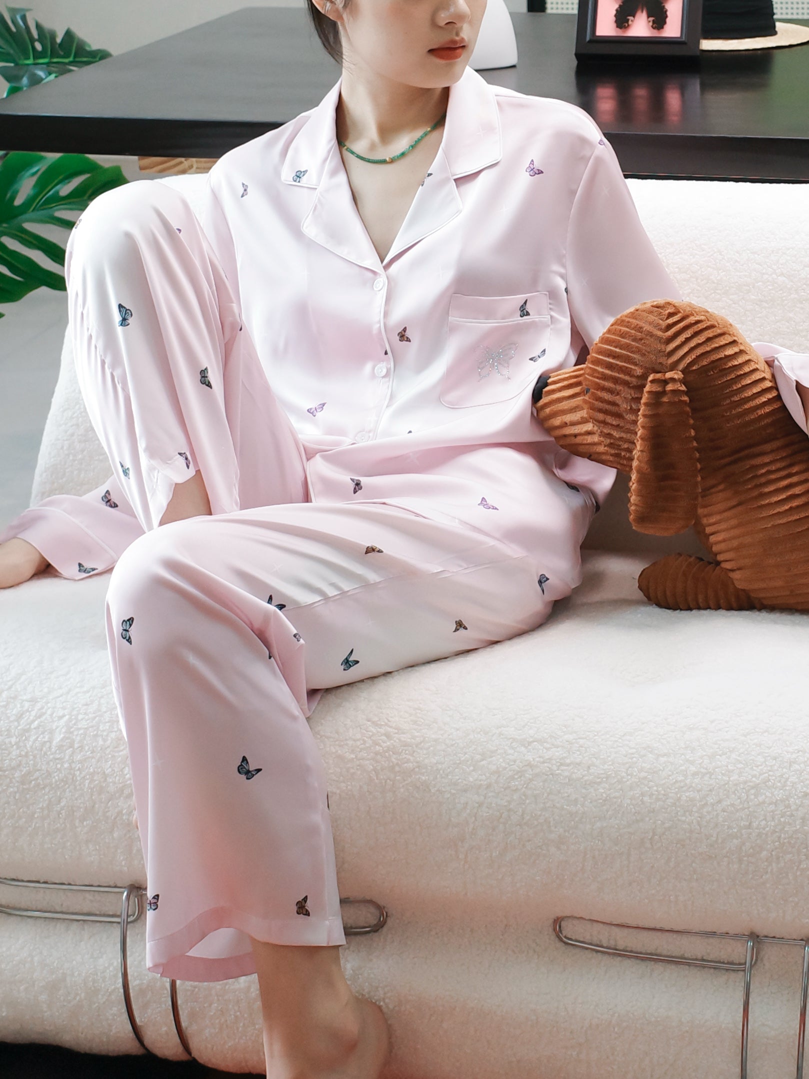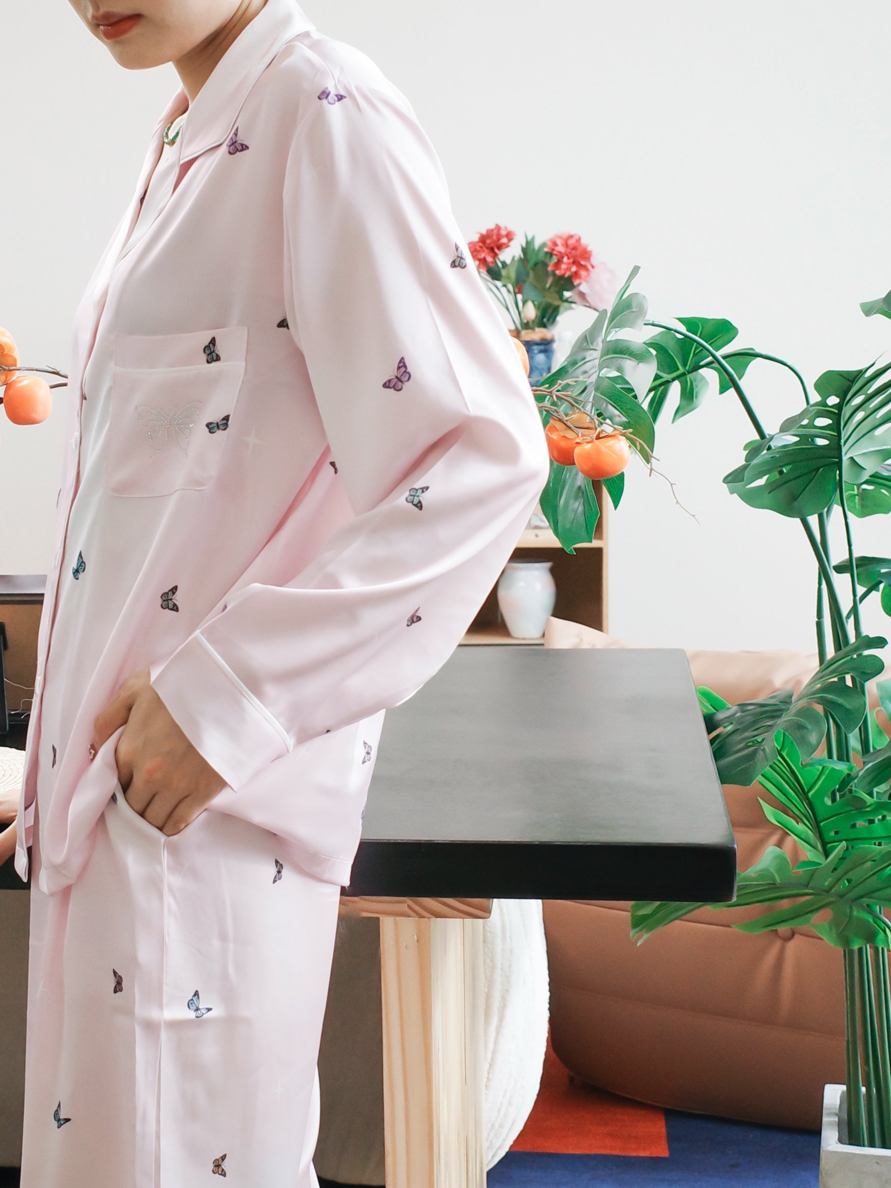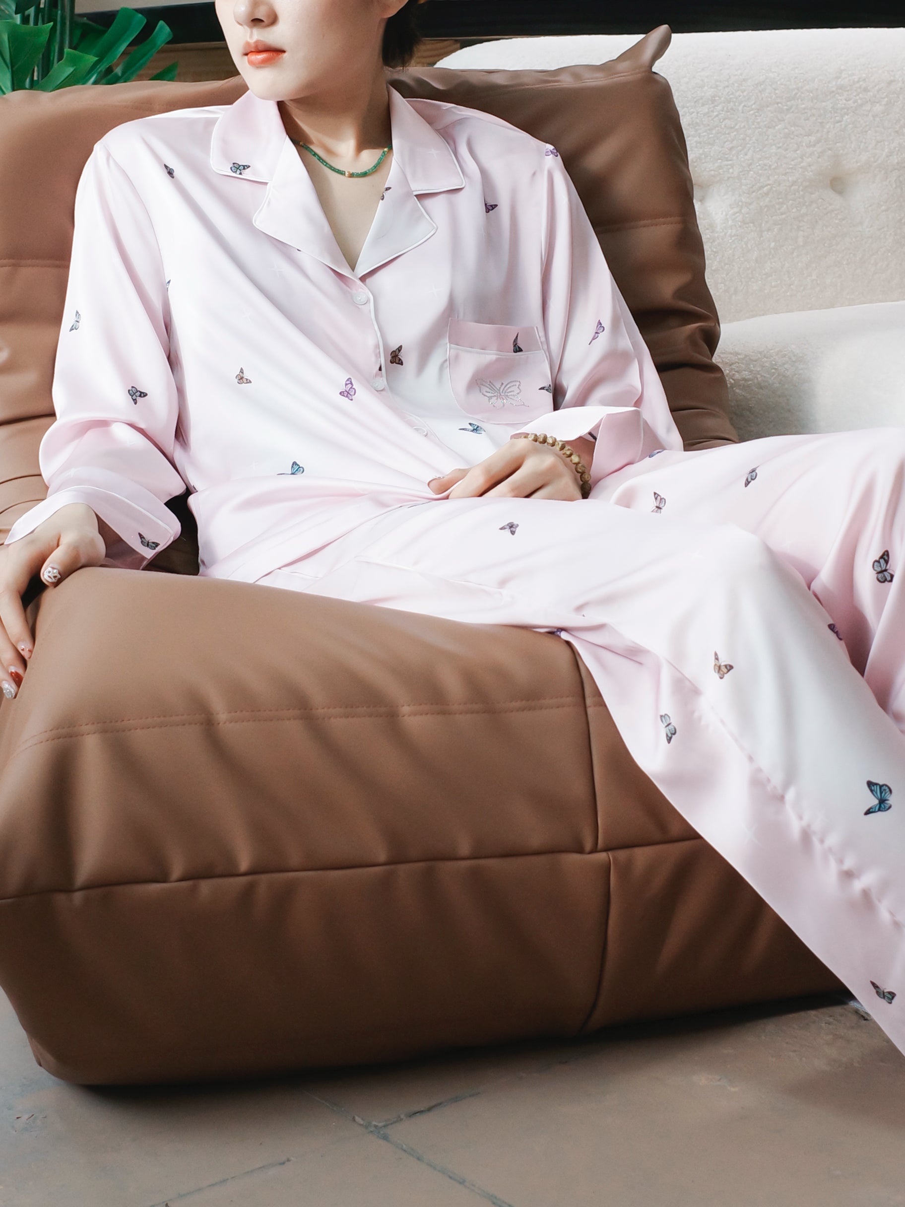 Crafted from smooth, silky satin in a pastel blush tone, this pajama set features subtle butterfly prints that flutter softly across the fabric — symbolizing freedom, beauty, and transformation. The relaxed button-down top and full-length pants flow effortlessly, wrapping you in a gentle, weightless touch that makes every evening feel like a quiet escape.
