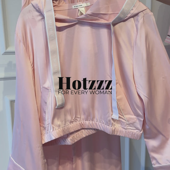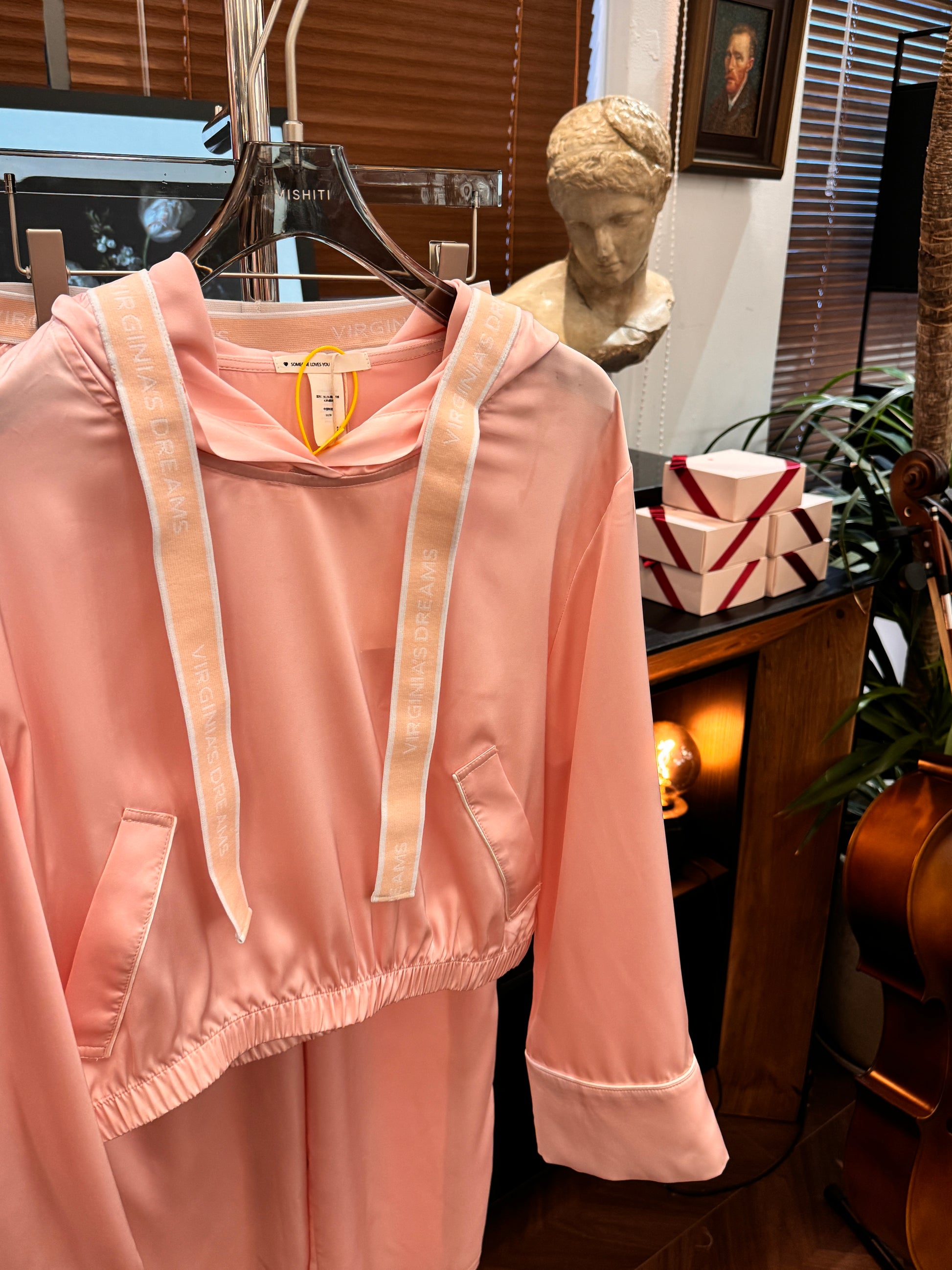 Crafted from high-gloss satin in a dreamy blush hue, this two-piece features a cropped hoodie top with wide statement sleeves and signature “VIRGINIA’S DREAMS” ribbon details, paired with relaxed-fit pants that flow with every move. Designed for ultimate ease and allure, it’s the perfect balance of comfort and sophistication.