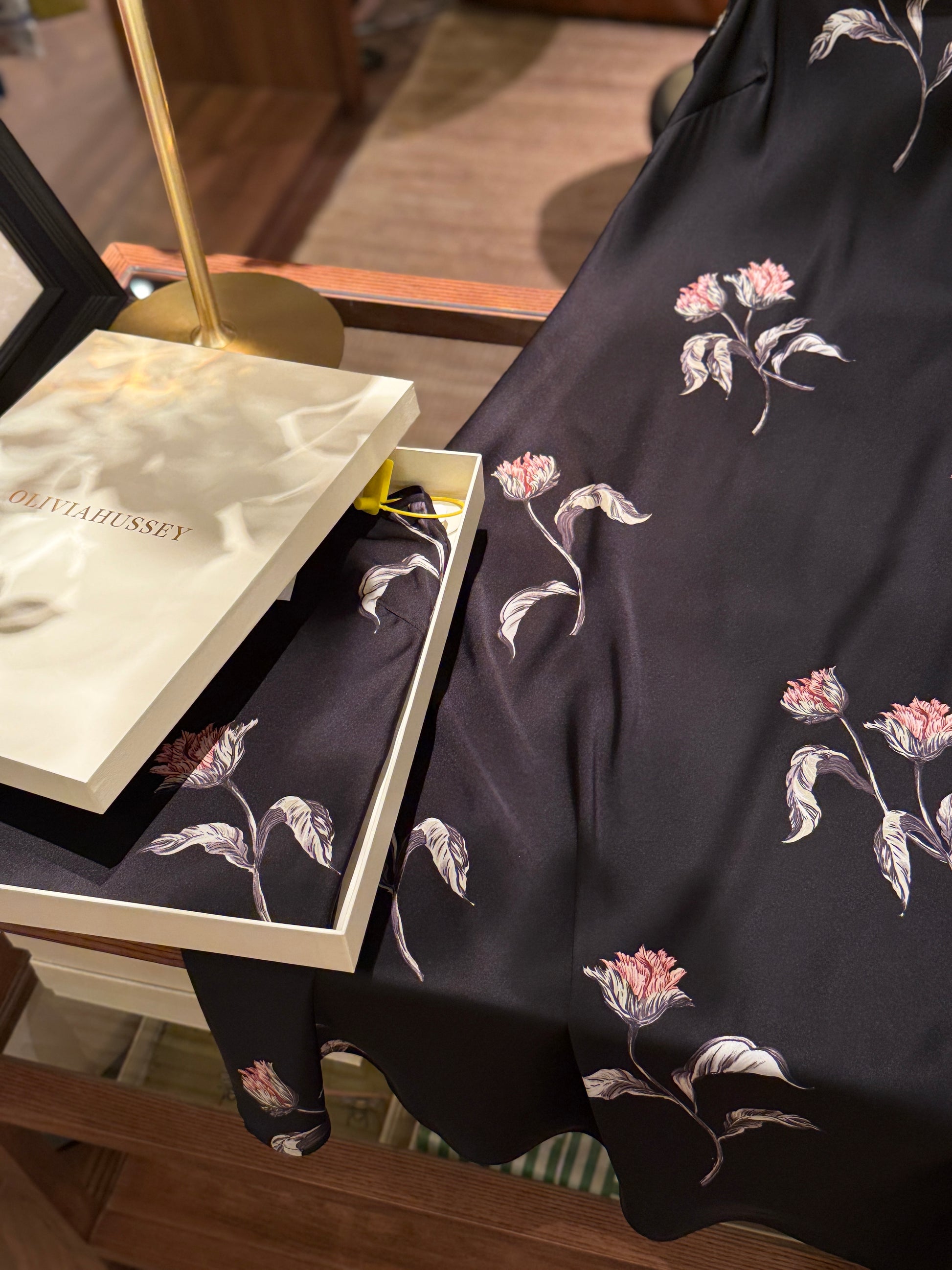 Crafted from high-luster satin in deep black, it drapes beautifully over the body, offering a silky touch that feels as luxurious as it looks. The delicate floral prints — soft blush petals against the dark canvas — evoke the quiet beauty of midnight blossoms under moonlight.