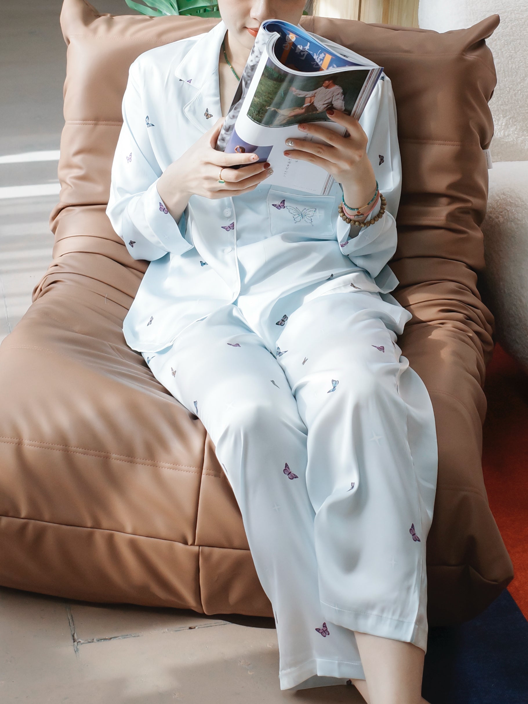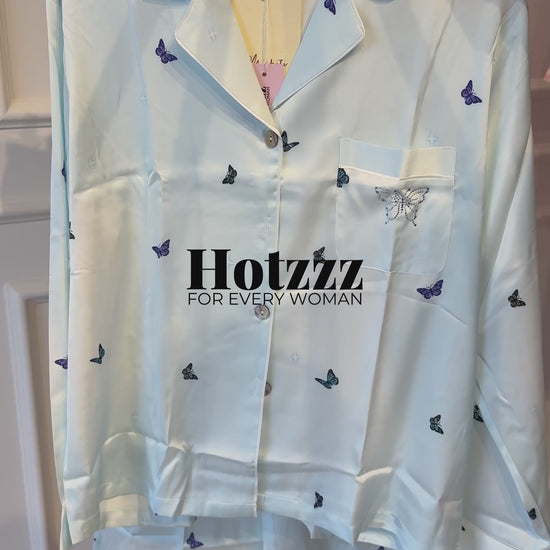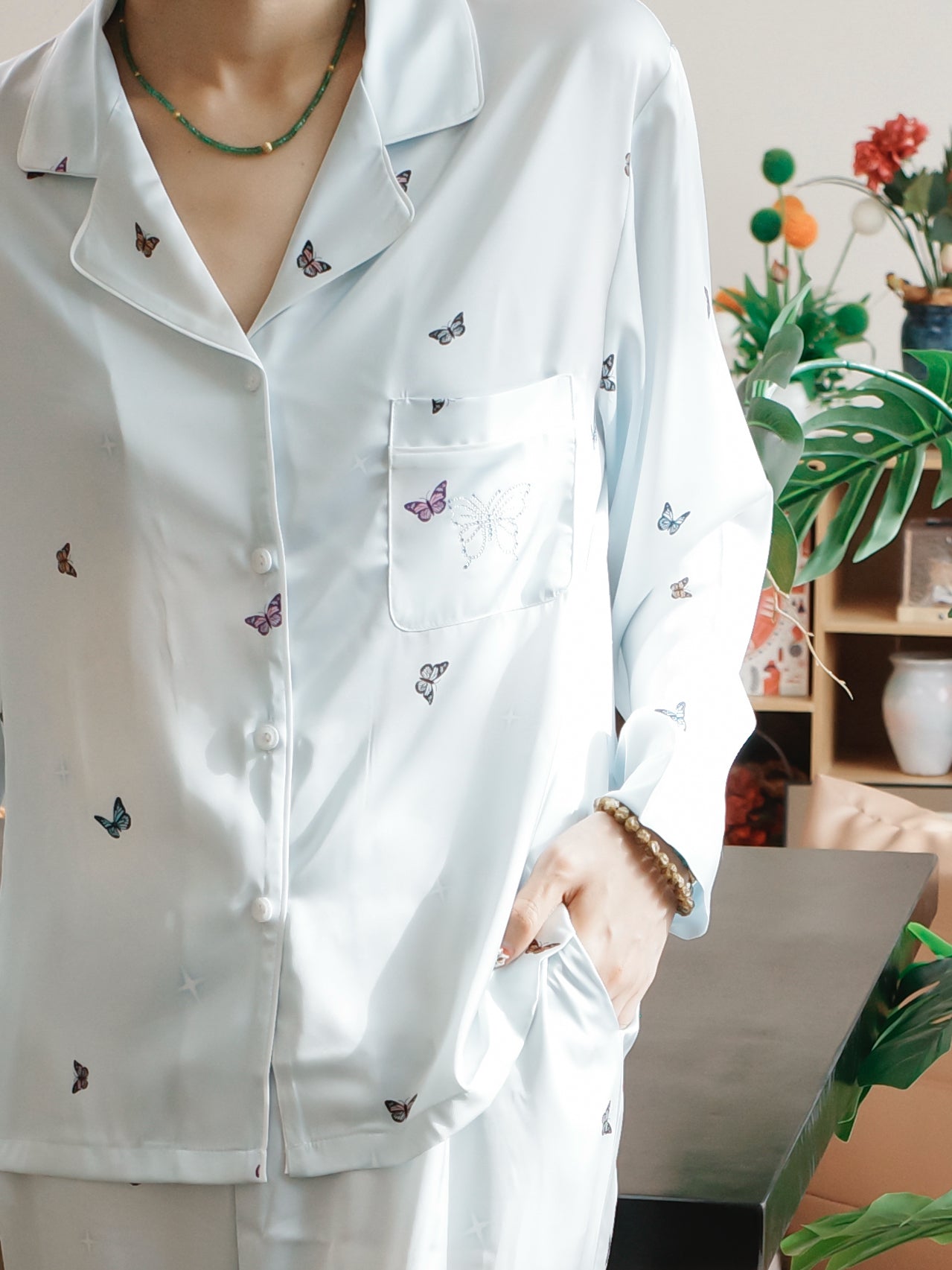 Made from smooth, high-shine satin in a refreshing mint tone, this pajama set features delicate butterfly motifs — each symbolizing transformation and lightness. The soft fabric glides effortlessly over the skin, while the relaxed cut ensures a flawless drape and freedom of movement.