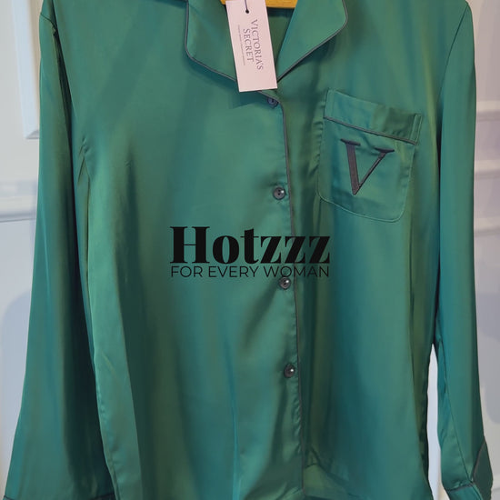 satin pant and matching long-sleeve top. (Mirror/HC) Includes top and bottom Easy fit Long-sleeve, button-front top hits below hips Pants with drawstring waist Machine wash Imported Composition