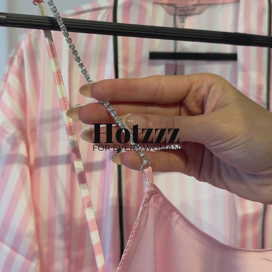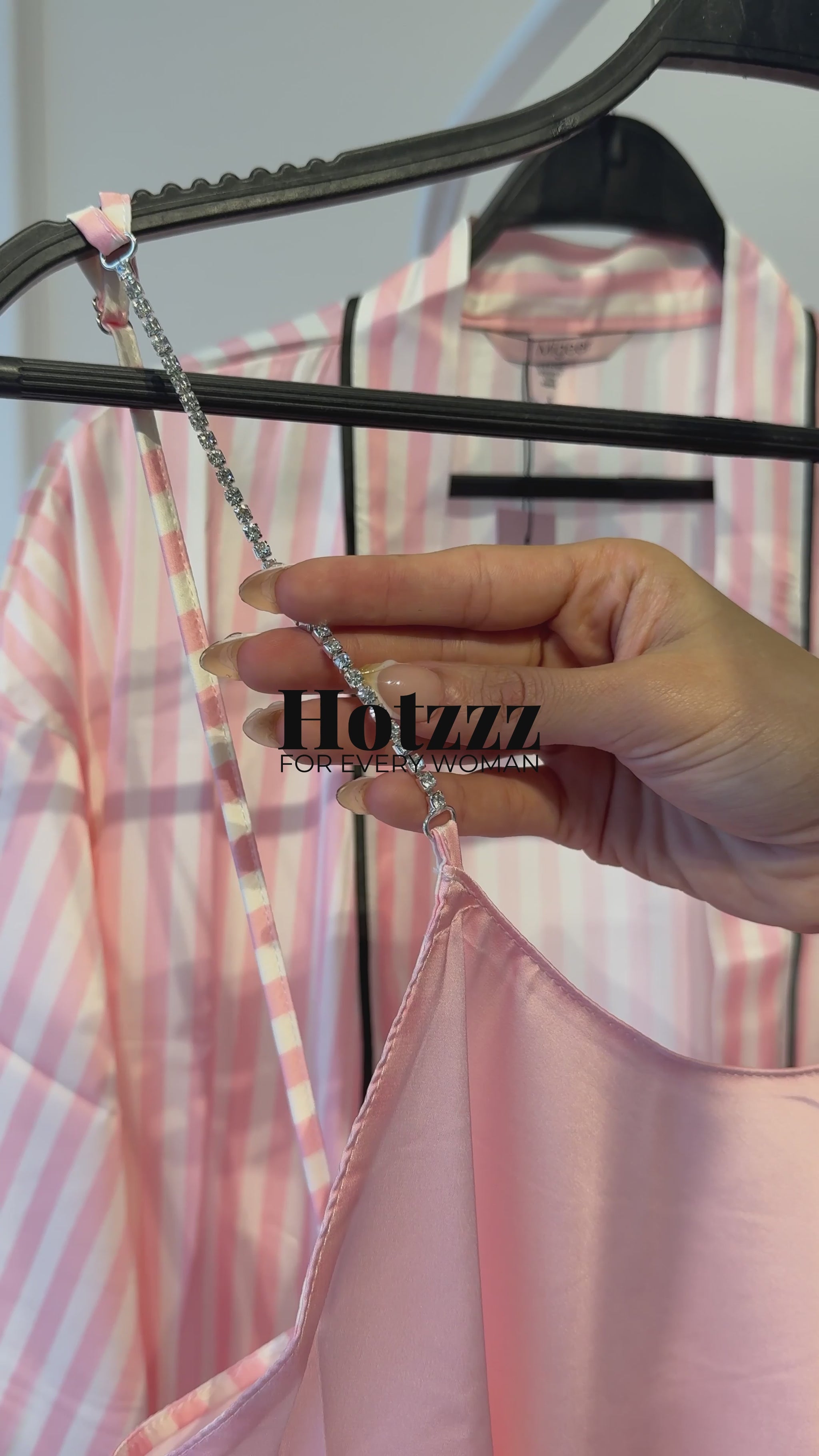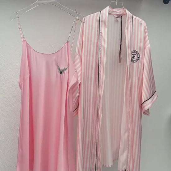This two-piece ensemble features a silky blush satin slip adorned with a delicate wing emblem — a symbol of freedom and elegance — paired with a matching striped robe trimmed in fine piping. Together, they create the perfect balance of sophistication and comfort, made for women who want to feel effortlessly beautiful from the moment they wake to the moment they unwind.